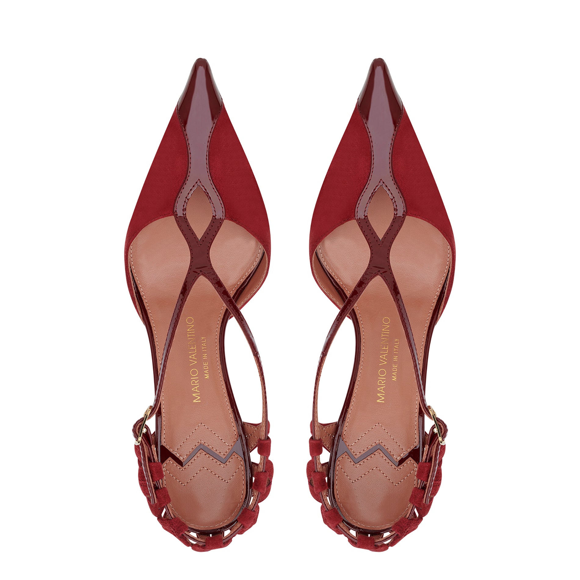 Elegant and classy, the new Mario Valentino pumps feature a lovely combination of patent leather and soft suede.The exclusive and remarkable interlaced manufacture is the expression of artisanal savoir-faire.The high heel and tapered toe grant elegance and glamour.
