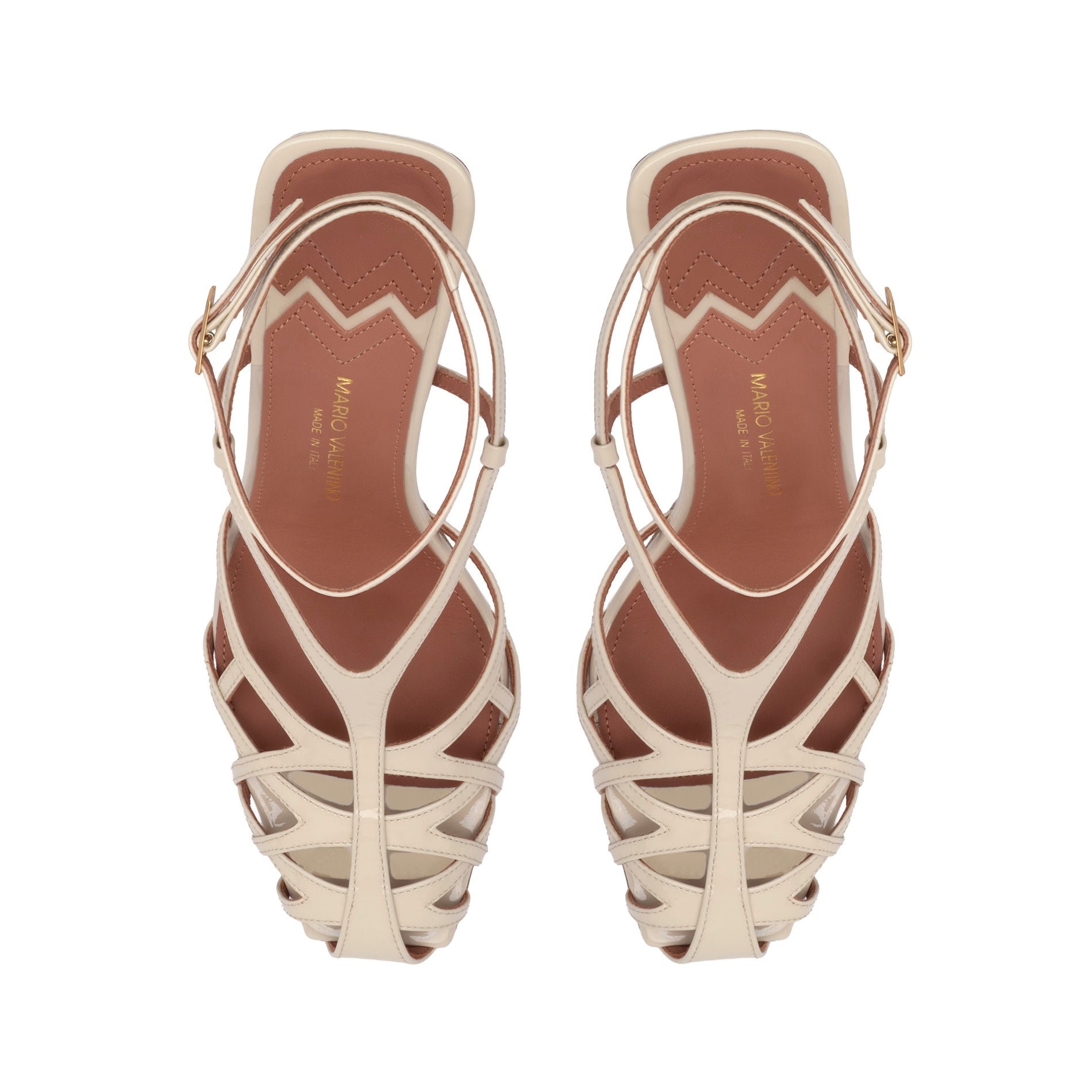 A modern take on a timeless aesthetic, the Kara sandal is defined by its refined cage silhouette. Crafted in glossy ivory patent leather, its slender straps frame the foot with precision and elegance.