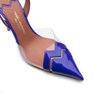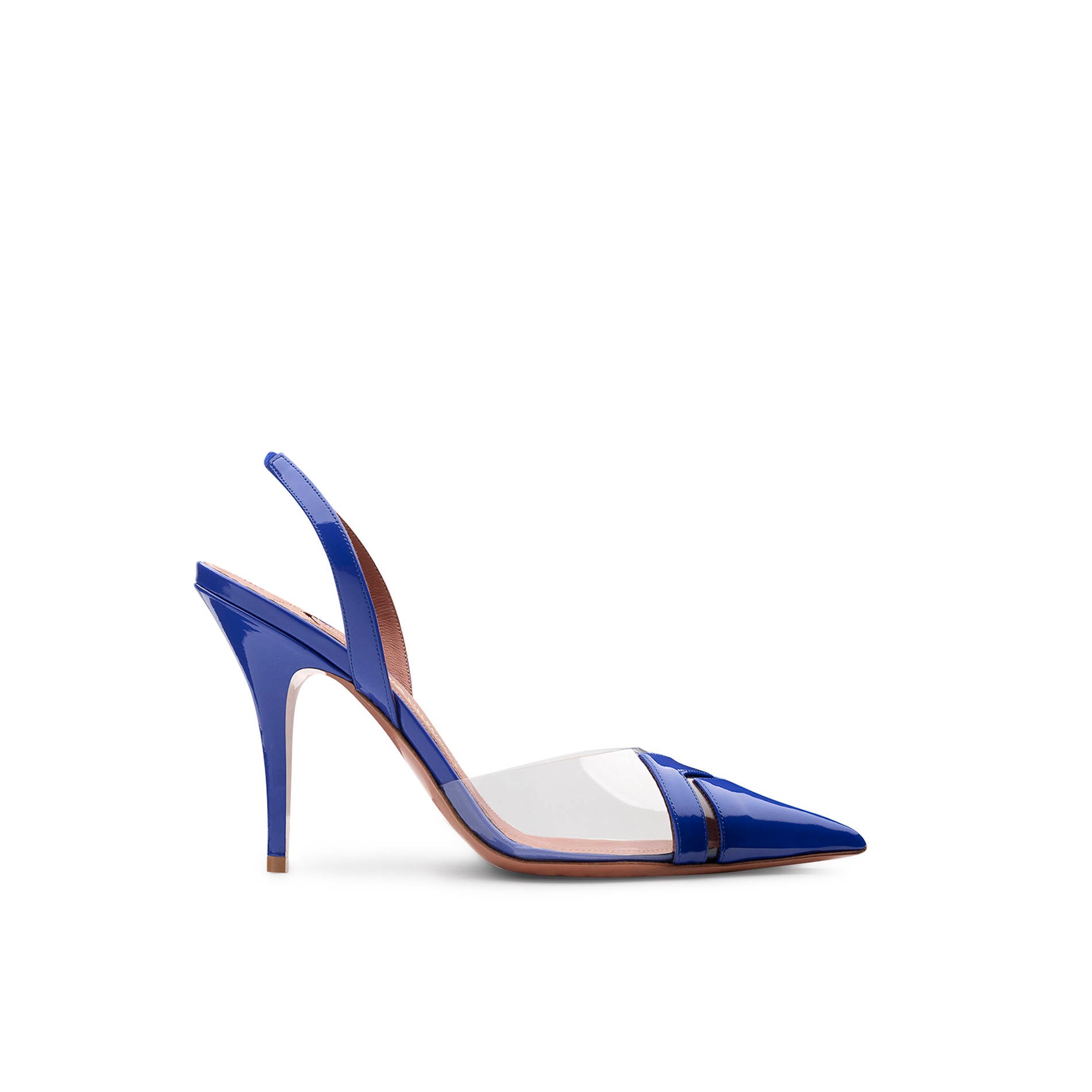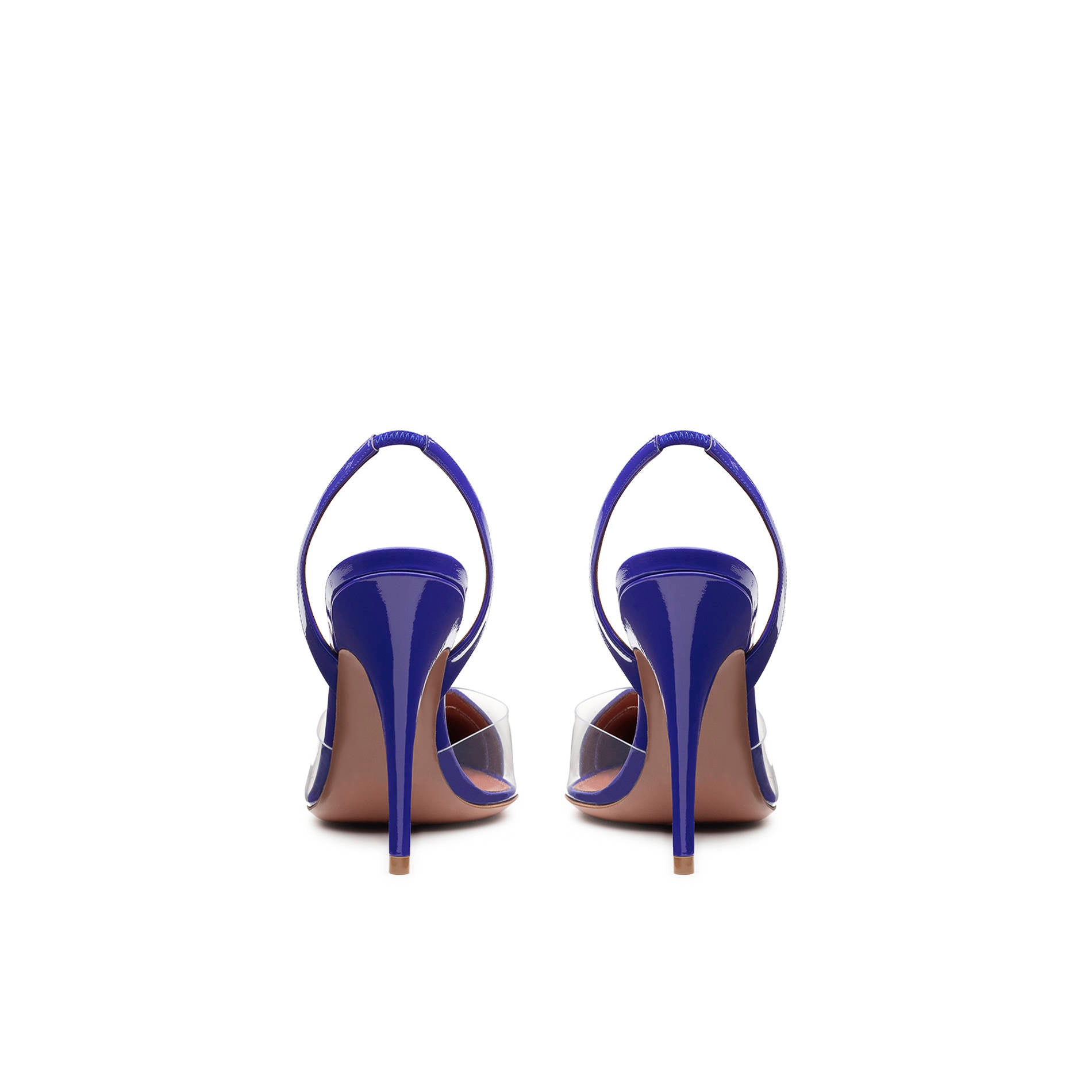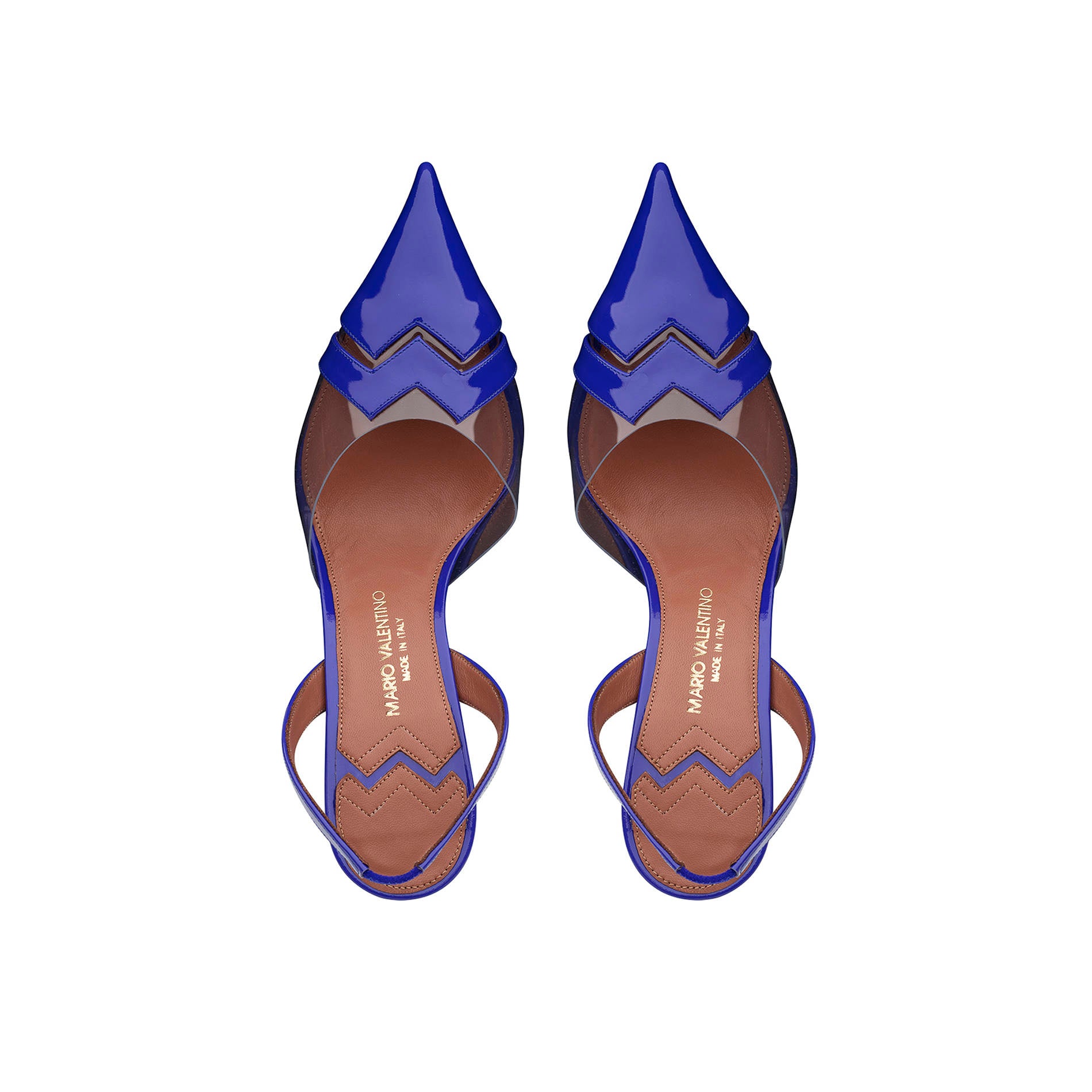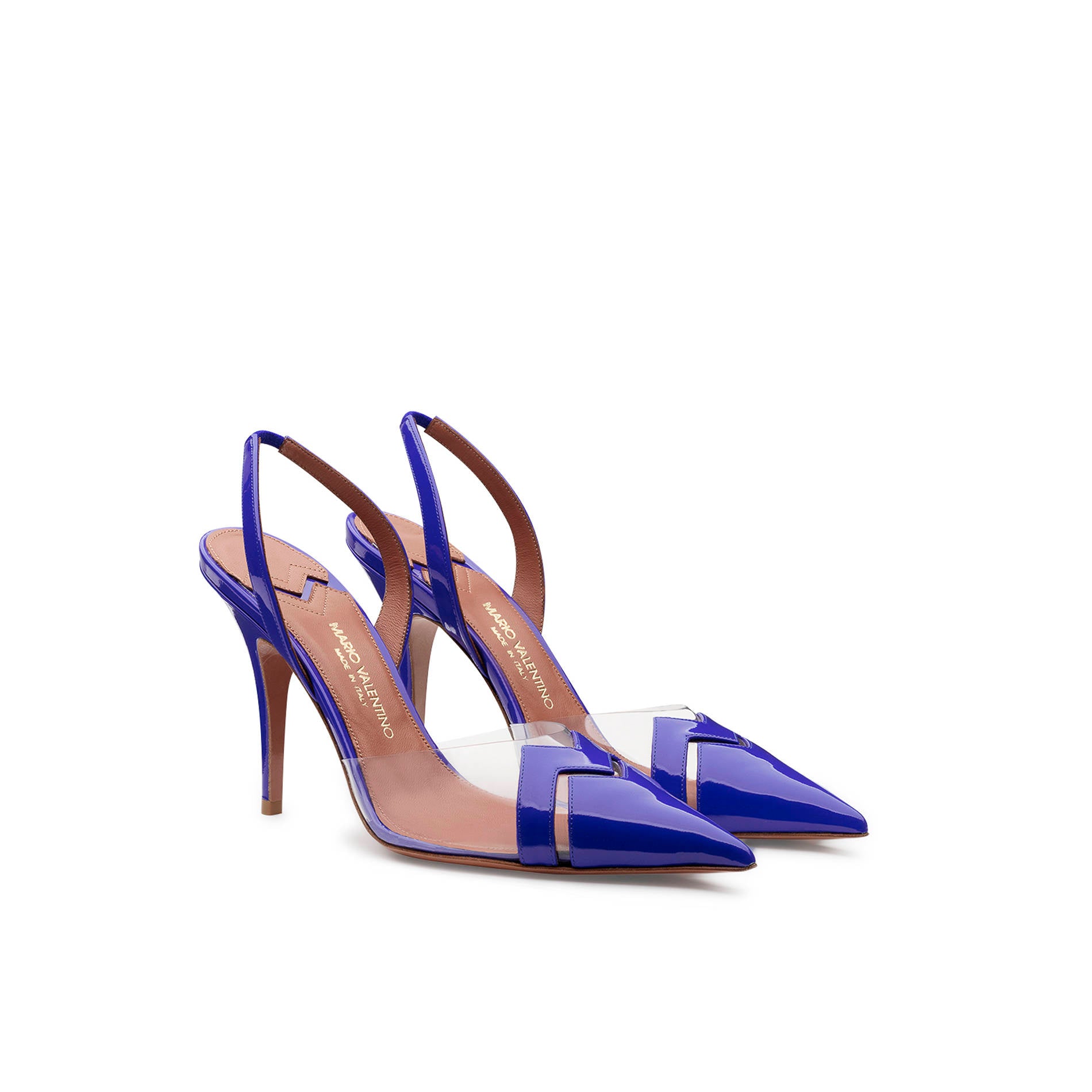 Perfect fusion of style and audacity, the new slingback Megan reimagines the most charming soul of the brand. The intense polish enhances the unmistakable MV logo decorating the alluring upper in soft transparent plexi. The stiletto high heel and tapered toe complete the iconic design.