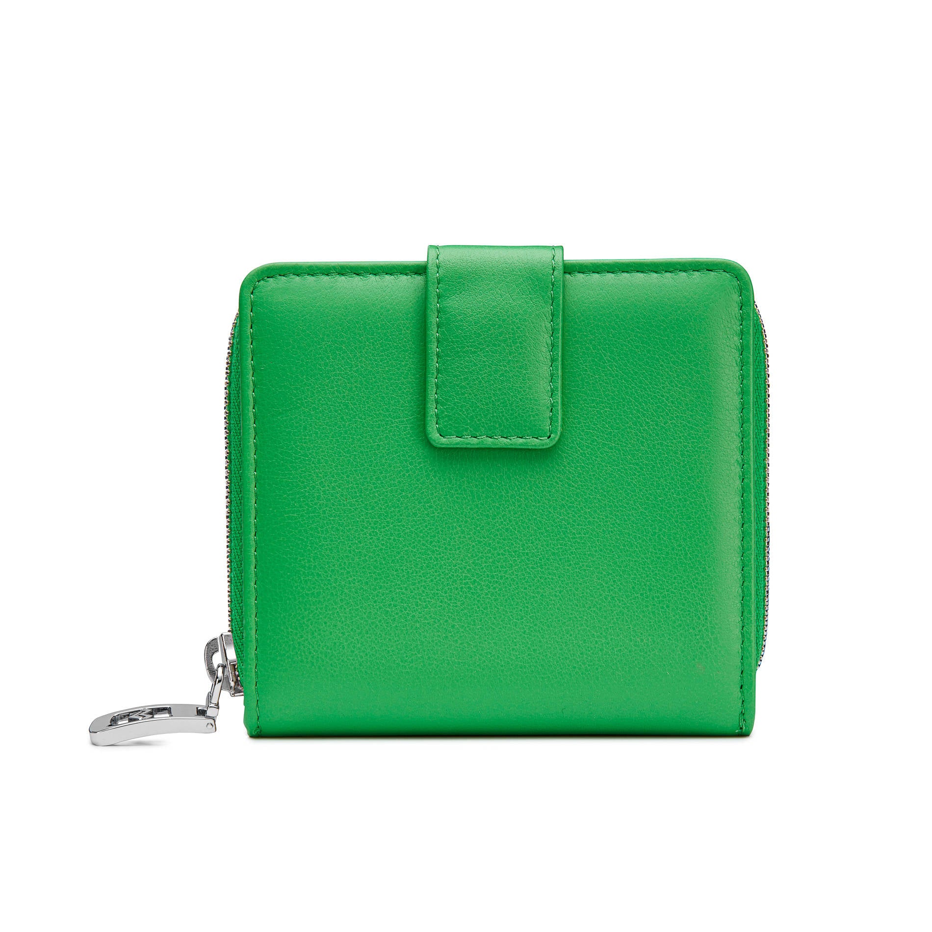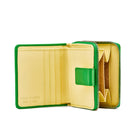 Functional elegance for the compact wallet presented in bicolor calfskin. The outer closure is clip-on while the interior has several slots for credit cards, a compartment for banknotes and a practical side pocket for coins.