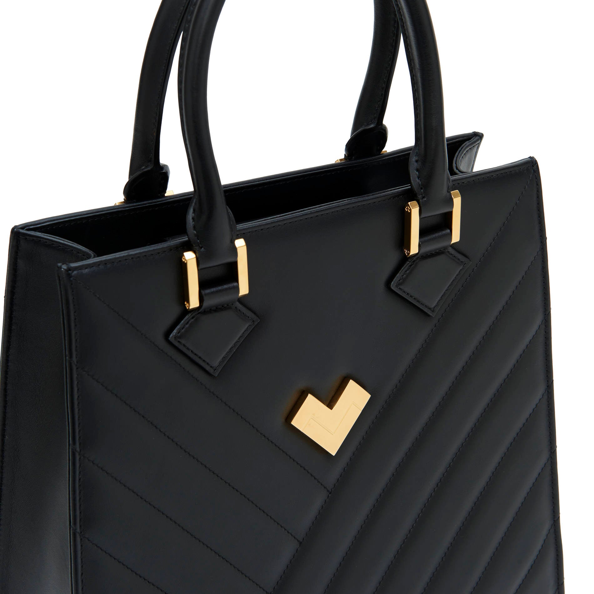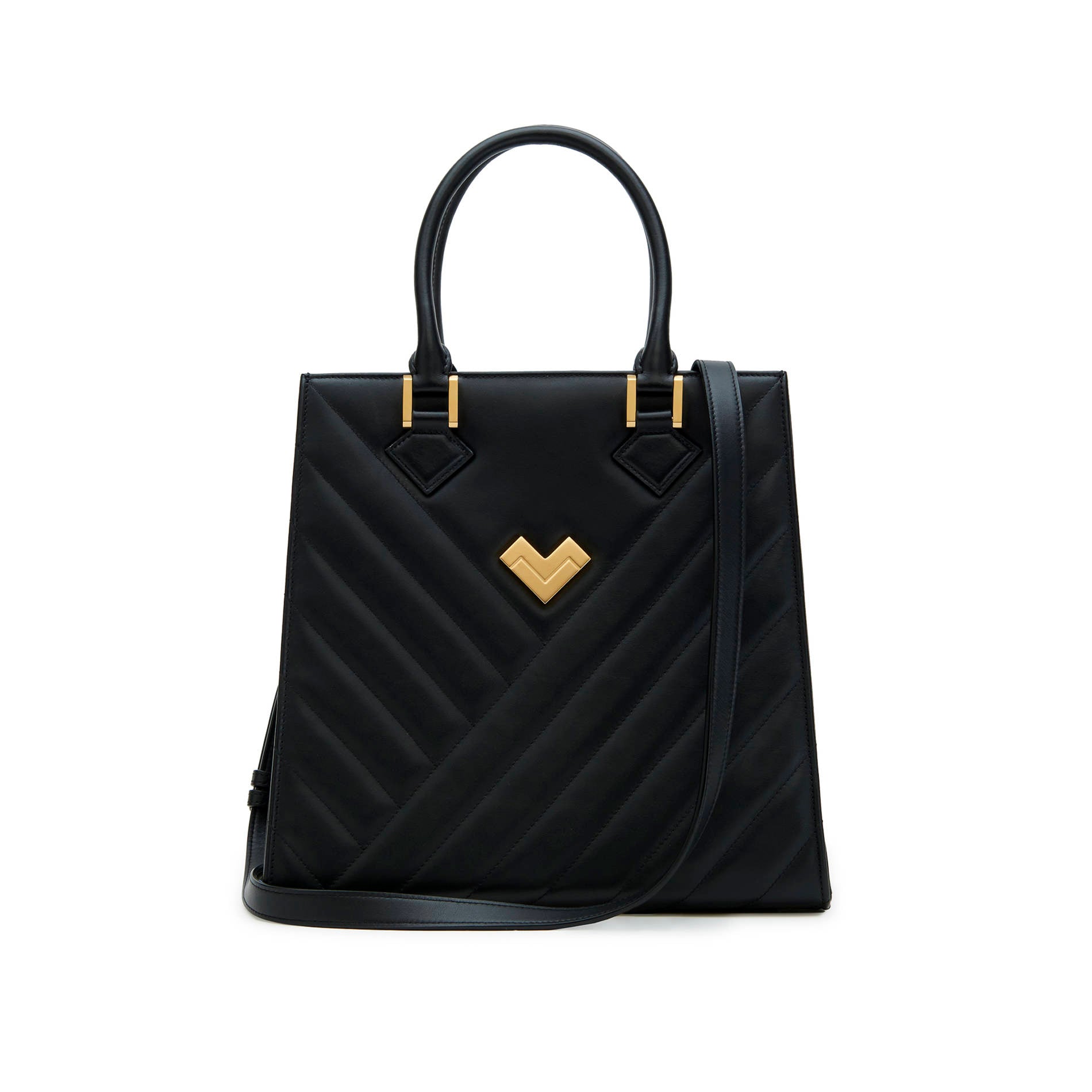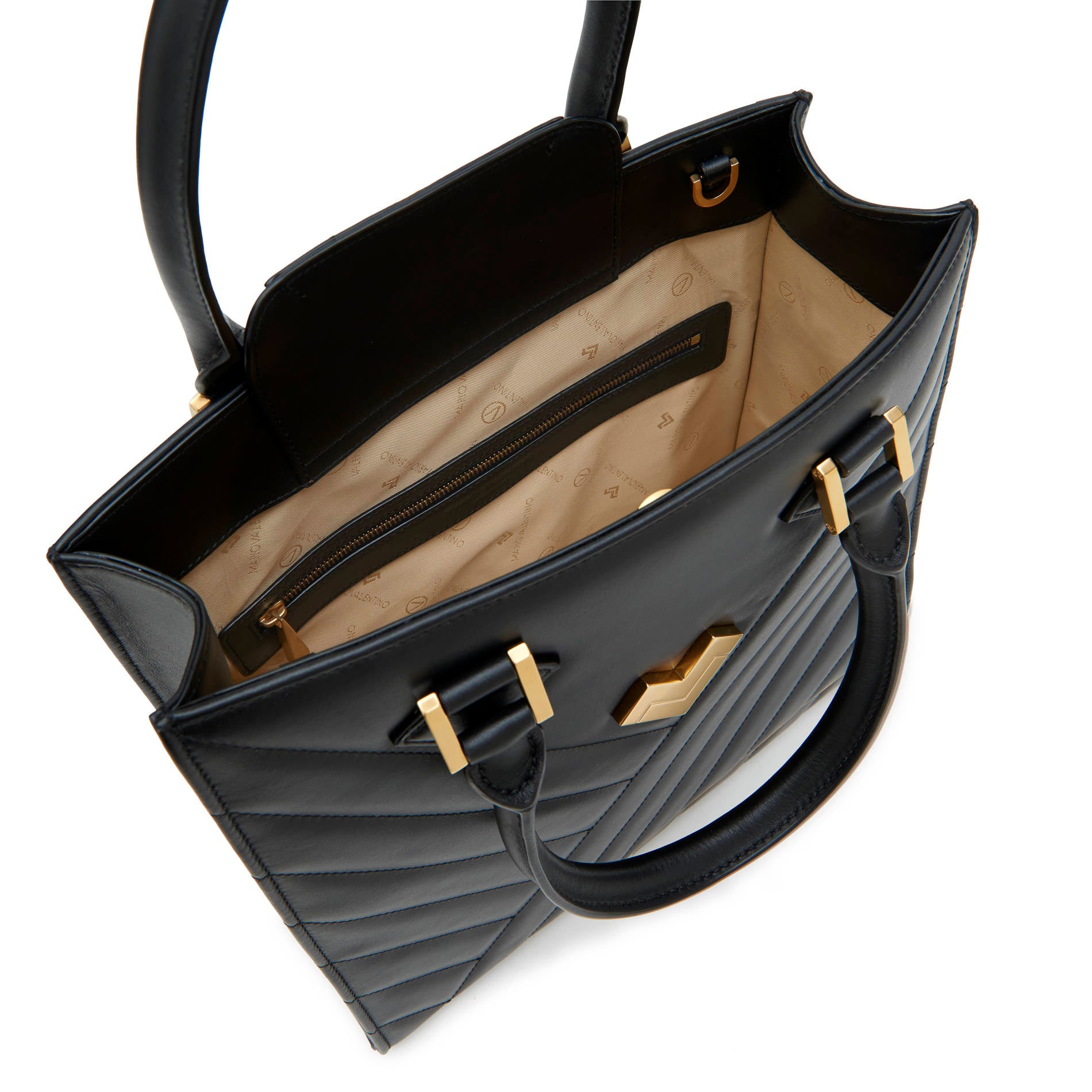 Quintessence of the Maison’s heritage, the new MV Icon bag tells a story of timeless elegance and craftsmanship.Modern and sophisticated, proposed in midi version, reimagines Mario Valentino's aesthetic codes thanks to a linear silhouette and a structured design. The soft calfskin is meticulously adorned with stitching that reveals a geometric pattern, the golden logo decorates and completes the overall result. Leather handles and adjustable and removable shoulder strap, it can be carried by hand, shoulder or cross-body.