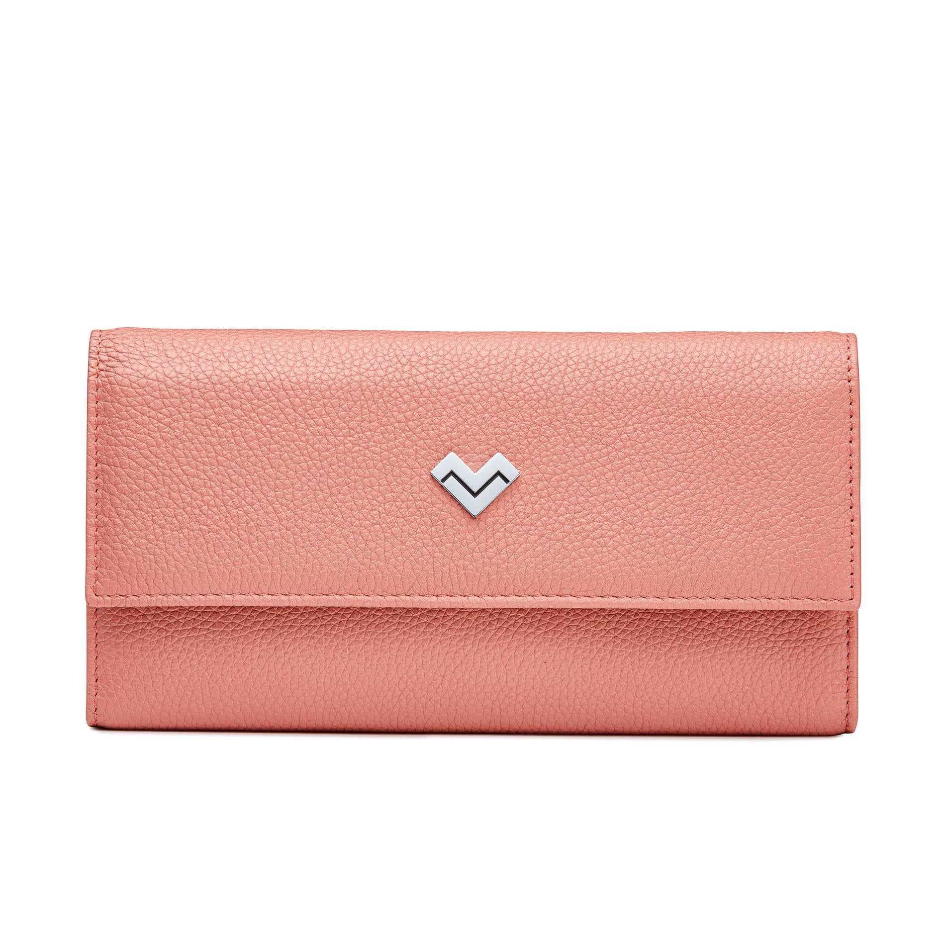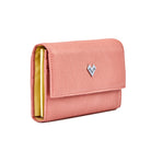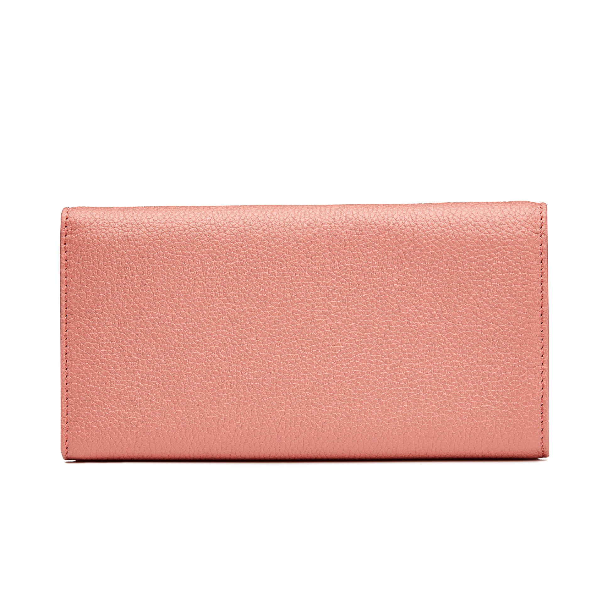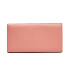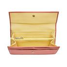 Envelope wallet in rich colored calfskin, made with panels in contrasting shades. The external closure is press-stud button while the inside has an organizer structure providing a convenient zip pocket for coins, various slots for credit cards and two large compartments for banknotes.