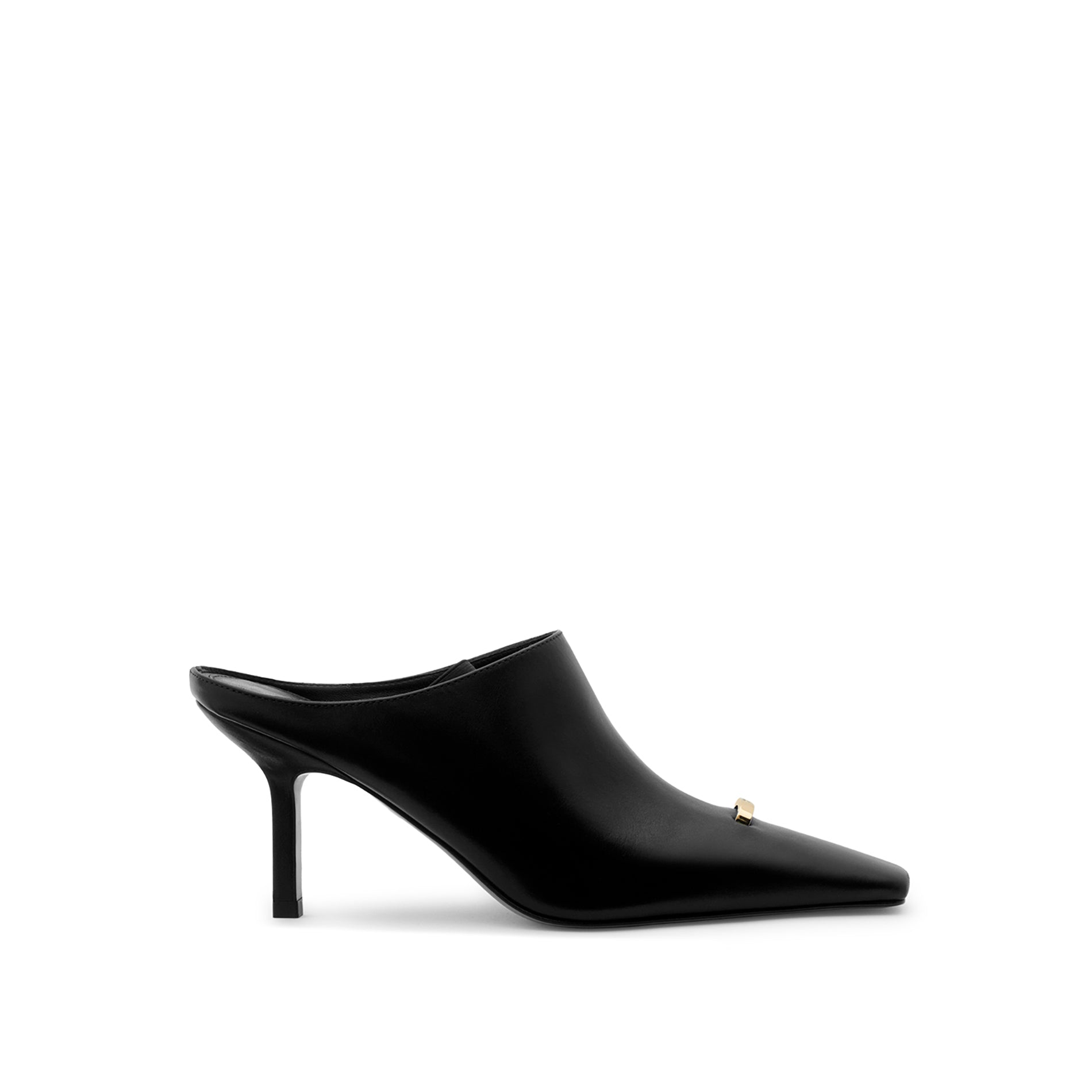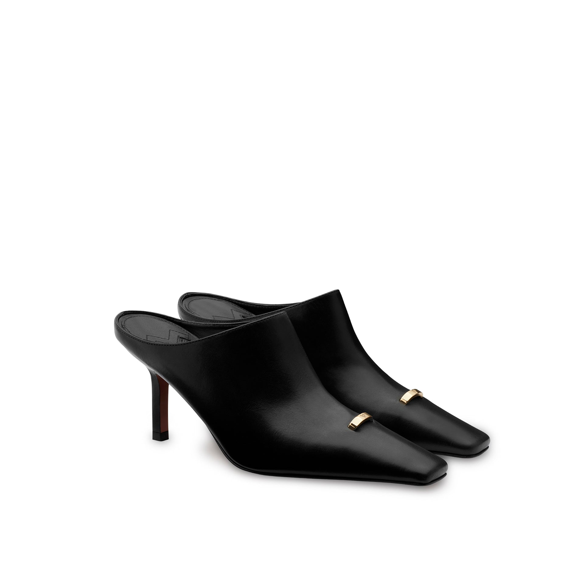 This sabot in delicate calfskin is the pure expression of style for the contemporary woman, distinguished by its bold square toe. The heel embraces the figure and the elegant accessory with the iconic logo enriches it, in so creating a true object of desire.