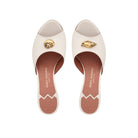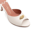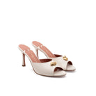 Espressione raffinata di eleganza e tradizione, il sabot Frida abbraccia la stagione estiva con grazia e spirito romantico. Con ampia fascia in morbido capretto, è arricchito dal prezioso accessorio marine dorato che ne completa il design. Il tacco stiletto e la punta stondata aggiungono stile alla silhouette.